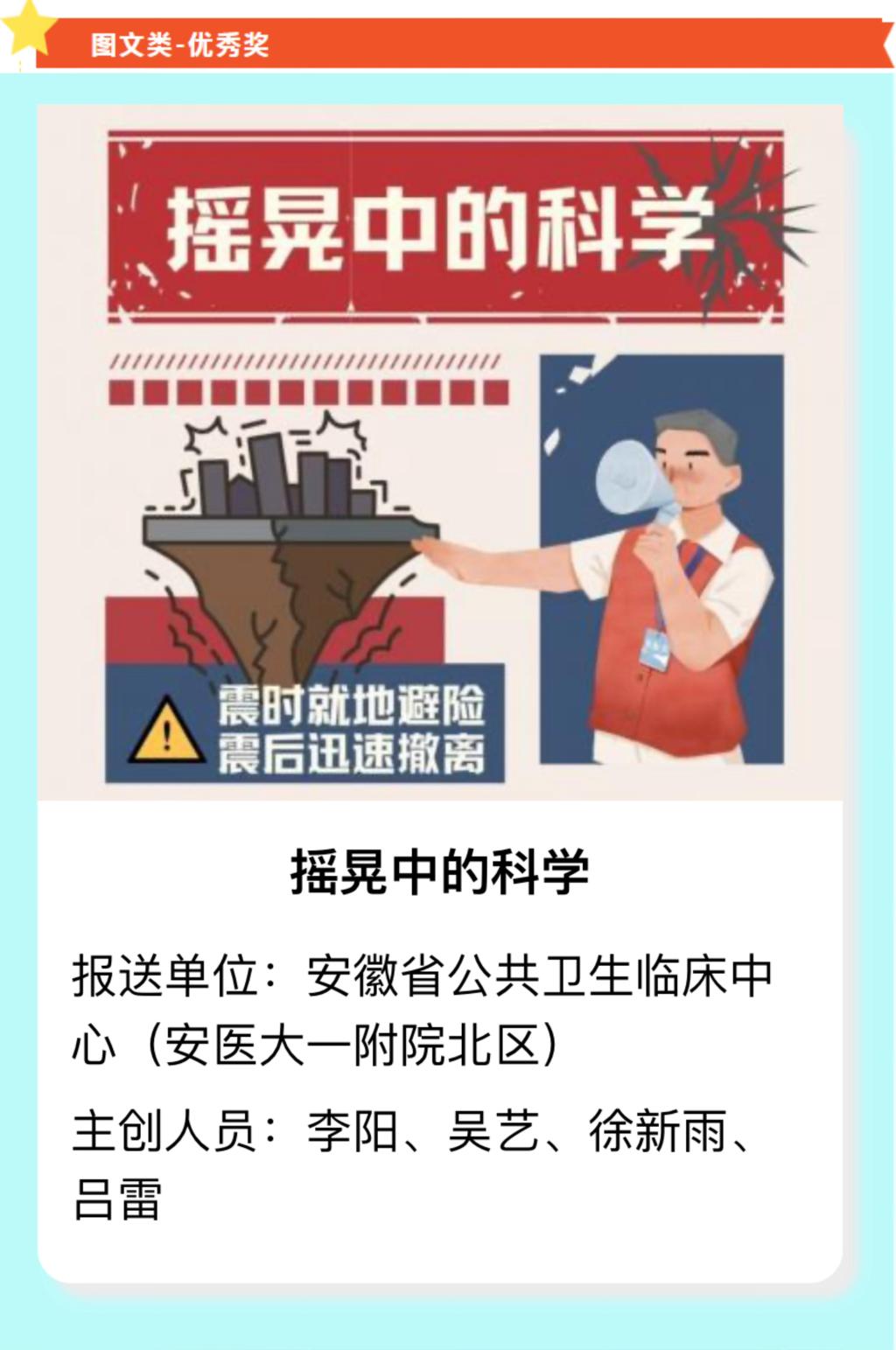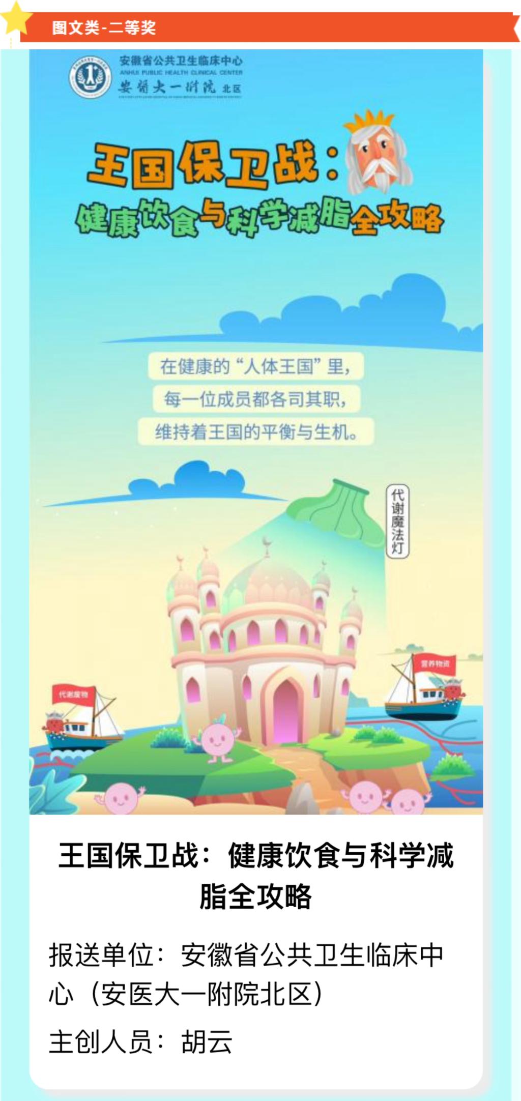 近日,由安徽省卫健委、安徽省科技厅、安徽省中医药管理局、安徽省疾控局、安徽省科协多部门联合举办的健康知识普及行动—2025年安徽省第六届新时代健康科普作品征集大赛结果揭晓。我院预防接种门诊作品《王国保卫战:健康饮食与科学减脂全攻略》、急诊小区作品《摇晃中的科学》经过激烈角逐,从全省1316件参赛作品中脱颖而出,分别荣获大赛图文类二等奖、优秀奖。