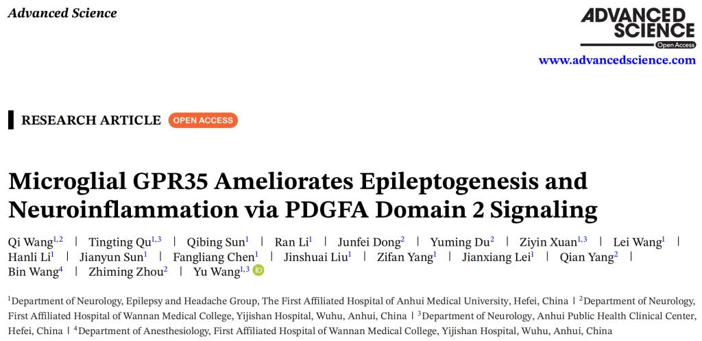 1月28日,我院副院长王玉教授团队在国际权威期刊Advanced Science(中科院一区TOP期刊,IF5y:15.6)在线发表原创研究论文“Microglial GPR35 Ameliorates Epileptogenesis and Neuroinflammation via PDGFA Domain 2 Signaling”,系统揭示了小胶质细胞GPR35通过PDGFA信号通路调控癫痫发生发展的新机制,为癫痫的疾病修饰治疗和精准干预策略提供了新的理论依据和潜在靶点。