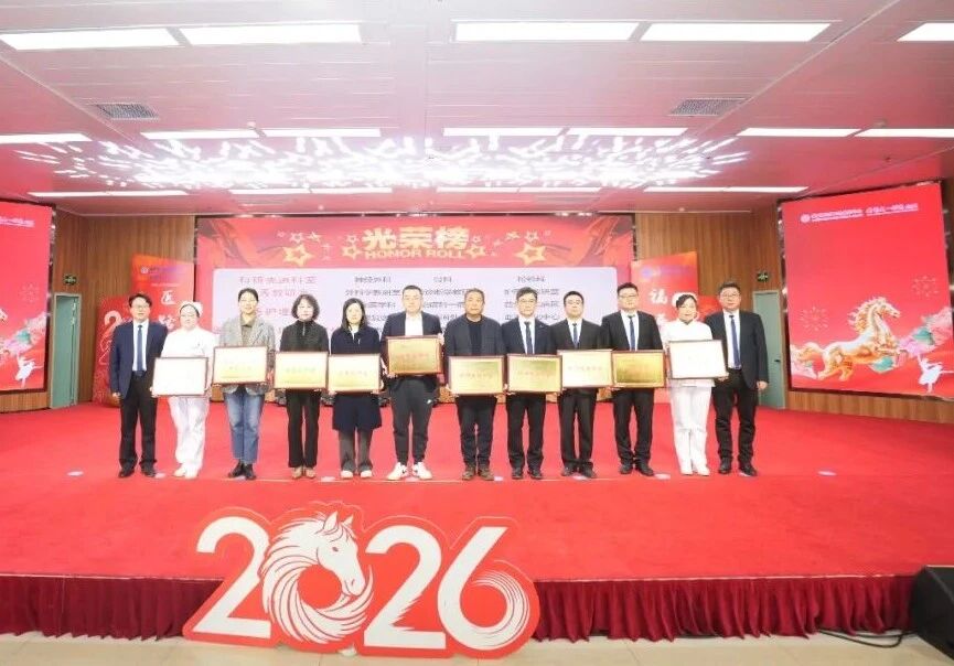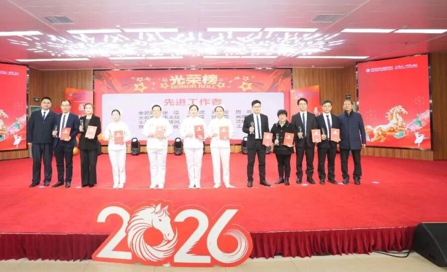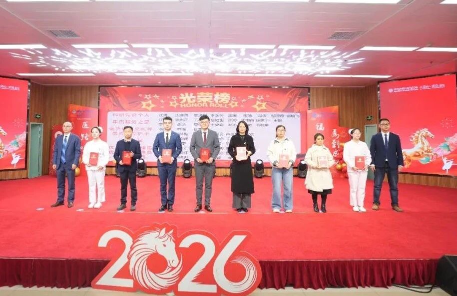 会议由院党委书记戴晓支主持,党委副书记、执行主任、执行院长李永怀作2025年总结报告和2026年工作动员,副院长王玉和党委副书记、副院长陈然宣读表彰决定,医院领导班子成员参加会议。