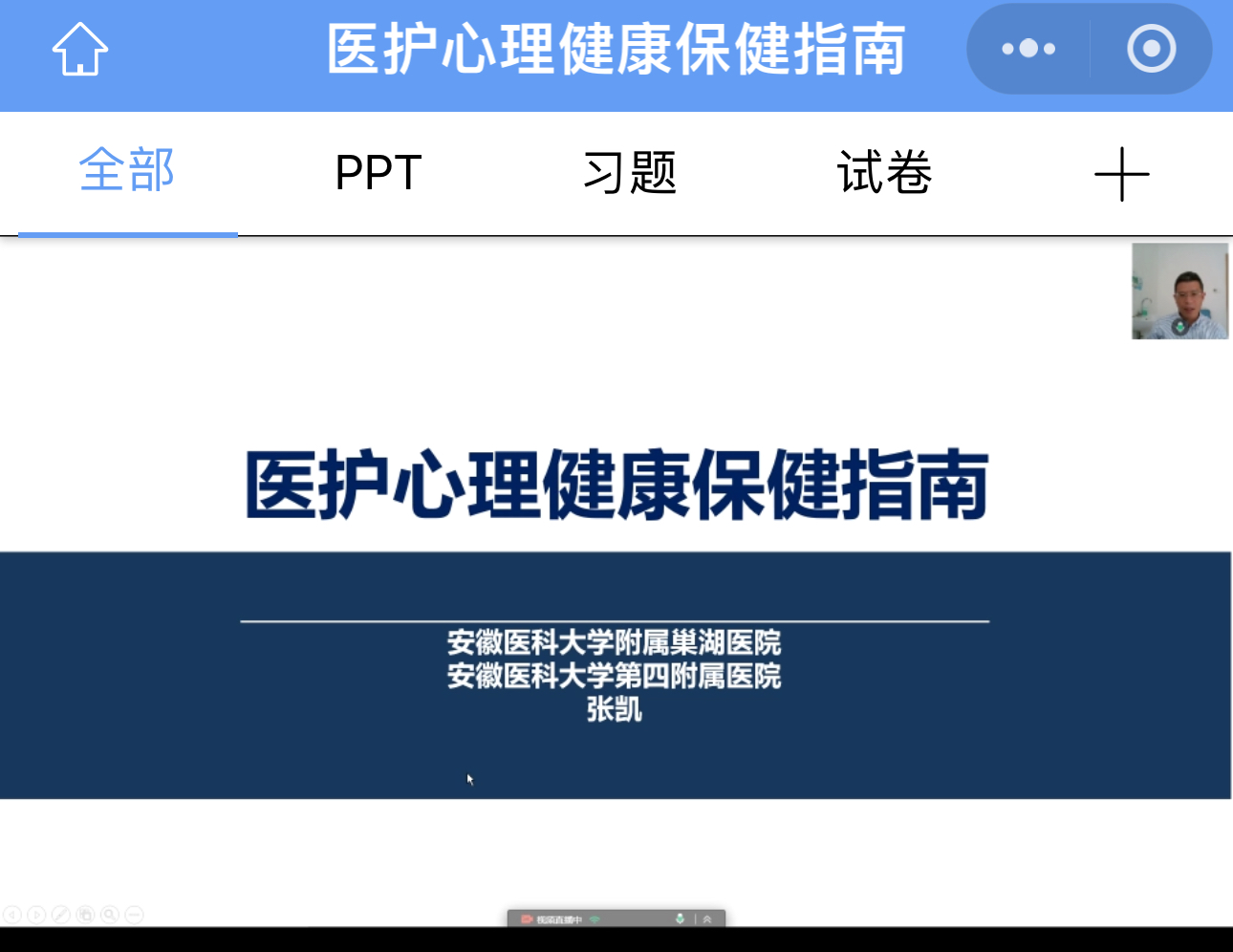 10月9日下午,健康促进办邀请安徽医科大学第四附属医院精神科主任张凯教授为全员职工进行《医护心理健康保健指南》线上专题讲座,为职工提供专业心理健康支持。