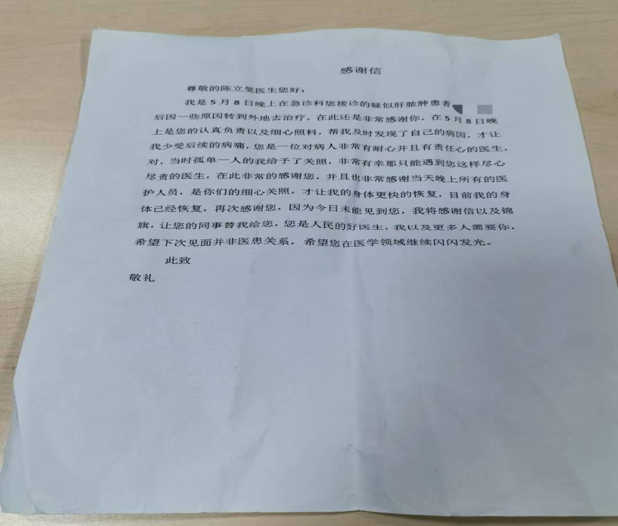 一面锦旗,一份认可;一声感谢,一份动力。在急诊这个没有硝烟的战场上,医护人员用速度与温情诠释着医者担当,这样的医患暖心故事,也成为医院里最动人的风景。(急诊医学科党支部 张妙景)